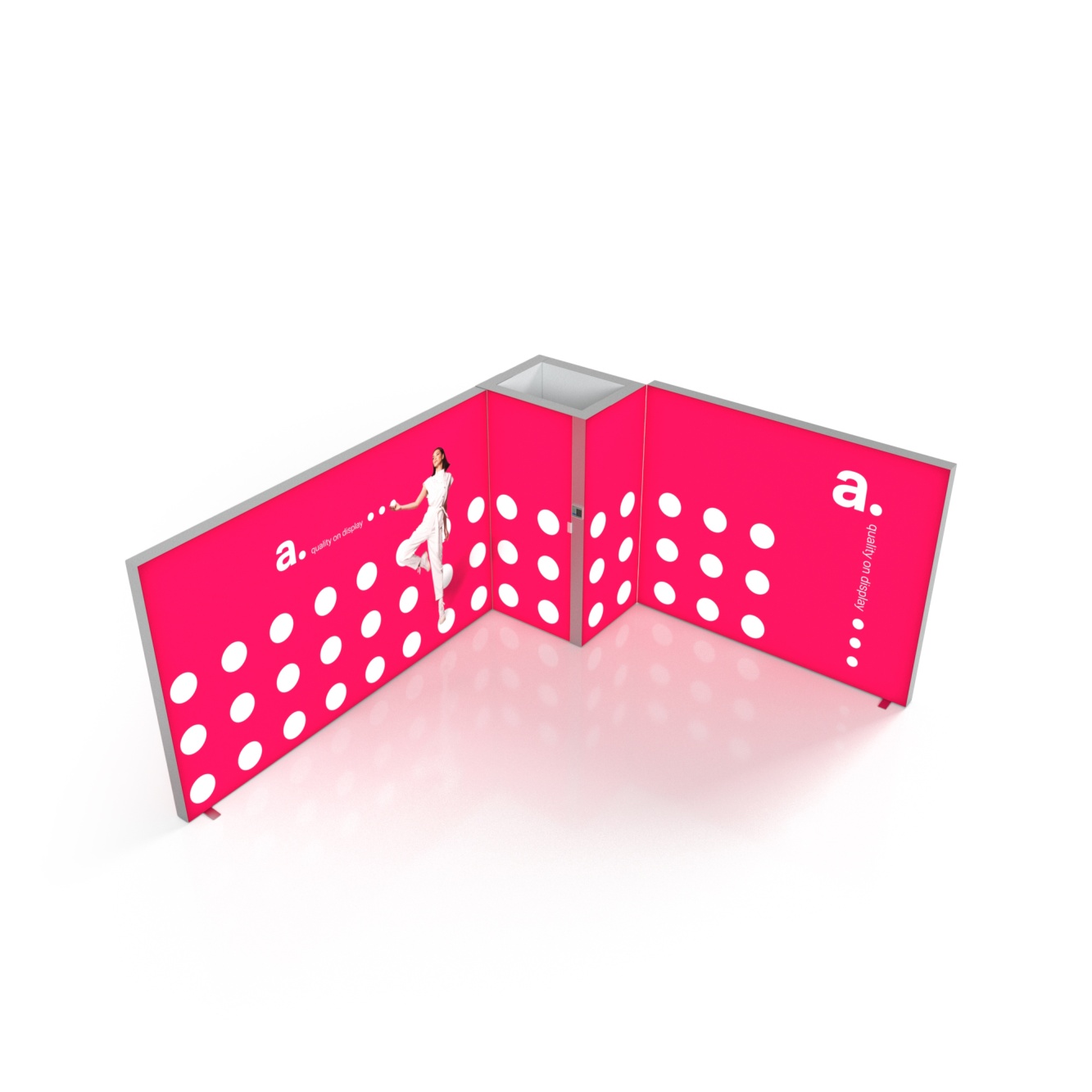 Zabudowa stoiska LMD to podświetlany, dwustronny system wystawienniczy, który wyróżni twoją markę i pomoże zaaranżować efektowne miejsce prezentacji. Stoisko na targi tego typu składa się z kasetonów ciętych na wymiar. W ich wnętrzu zamontowane są diody LED, które równomiernie oświetlają tekstylne wydruki, na których umieścimy twoje spersonalizowane grafiki. Montaż stoiska wystawowego odbywa się za pomocą kluczy imbusowych.
