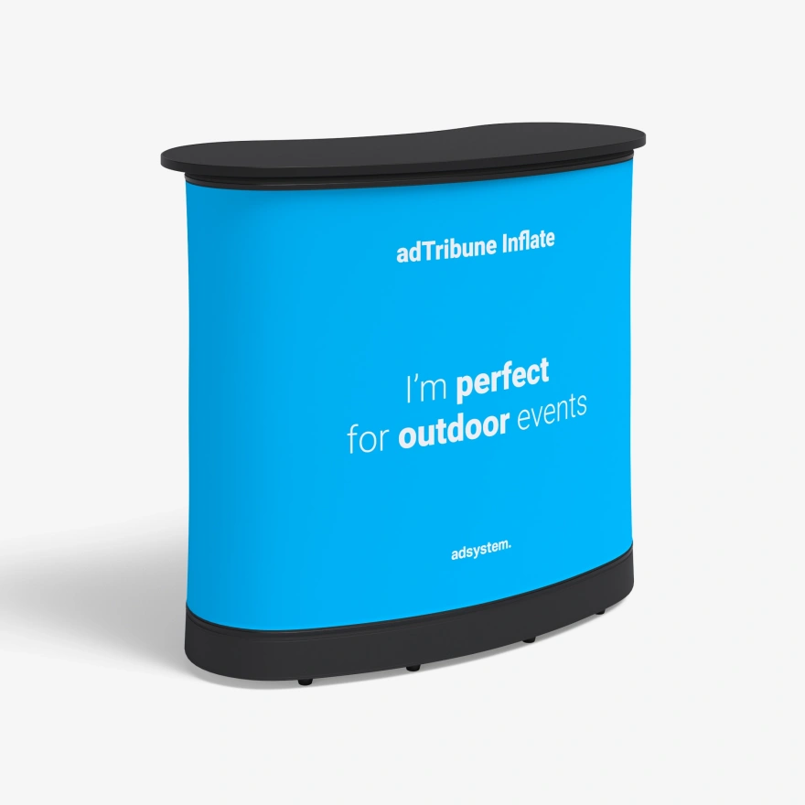 Ein aufblasbarer, robuster Messestand, der entwickelt wurde, um Besucher während Outdoor-Events anzulocken. adTribune Inflate ist dein neues Kommandozentrum für Messen, Picknicks und Festivals. Ausgestattet mit einer großzügigen Arbeitsfläche und internen Regalen, eignet es sich perfekt als Aussteller für Produkte, Kataloge oder Broschüren. Oder einfach – als ein Platz, an dem sich deine Kunden versammeln können.