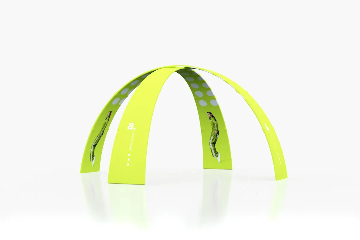 adWall Vario Arch A+B ist ein kuppelförmiges Textiltor, das du bei verschiedenen Marketingaktivitäten verwenden kannst. Mit diesem Produkt kannst du einen Stand oder einen wichtigen Punkt auf dem Veranstaltungsplan oder den Präsentationsort von Produkten markieren. Das kuppelförmige Textiltor besteht aus zwei textilen Wänden in Form eines Bogens, und ihre Konstruktion basiert auf einer Kombination aus Aluminiumrohren. Das Ganze wird mit Textildrucken vervollständigt.