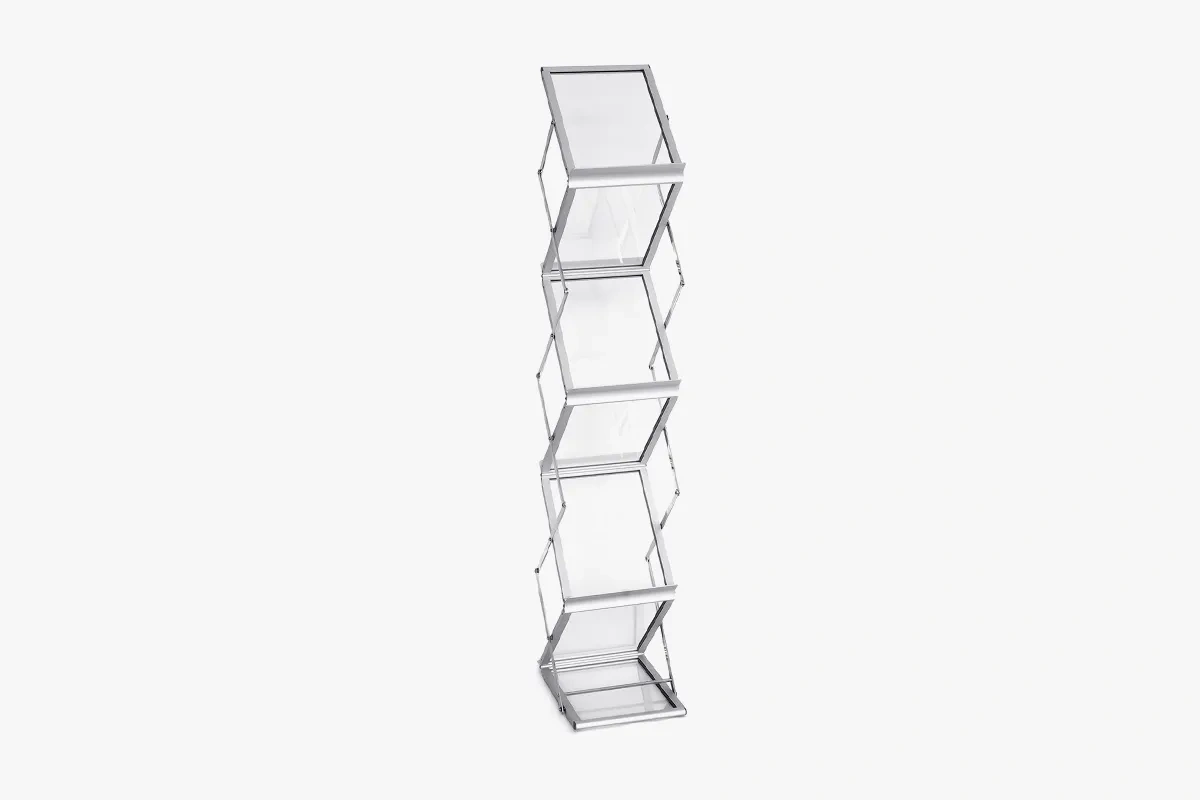 adFolder to stojak na ulotki, który łączy elegancki design z funkcjonalnością. Wykonany z wytrzymałego aluminium i przezroczystego szkła akrylowego, doskonale eksponuje materiały promocyjne, jednocześnie wpisując się w estetykę nowoczesnych przestrzeni handlowych i wystawienniczych.
