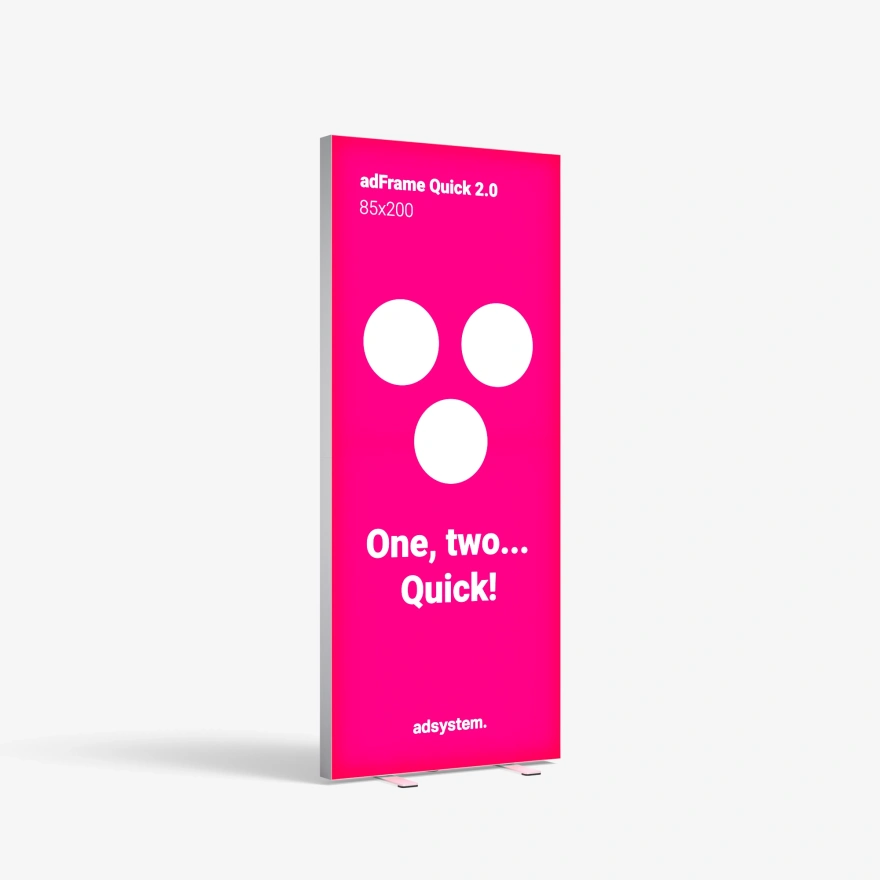 adFrame Quick 2.0 is a double-sided illuminated advertising lightbox, distinguished by its lightweight construction and high-quality fabric print. Magnets built into the frame allow you to quickly connect several lightboxes into one larger display – without additional tools or accessories. This freestanding system is an eye-catching alternative to a traditional roll-up, perfect for making your stand stand out at trade fairs or events.