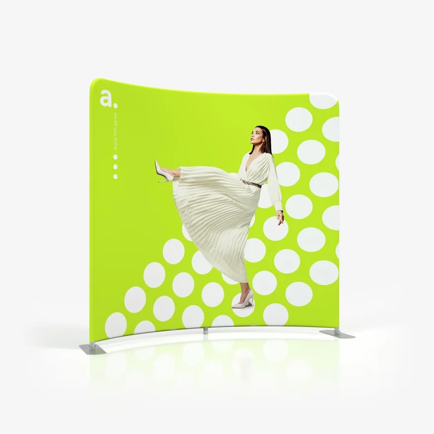 adWall Vario Curved Premium is a curved trade show wall that will support your promotional activities. You can use it at promotions, conferences, or industry meetings. We used 43 mm wide aluminum profiles for the structure, and your personalized graphic will be printed on textile material.