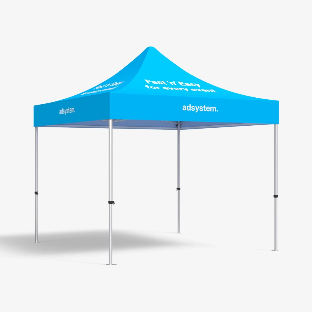 adTent Express customized tents for events are versatile products, ideal for various types of outdoor and indoor events. These tents protect your stand from sun and rain while also defining the boundaries of your space. With personalized prints featuring your brand's graphics, the tents serve as an effective advertising tool, attracting attention and drawing visitors to your stand. The product includes an aluminum structure with a roof composed of accordion-style rods, allowing for quick and practical setup.