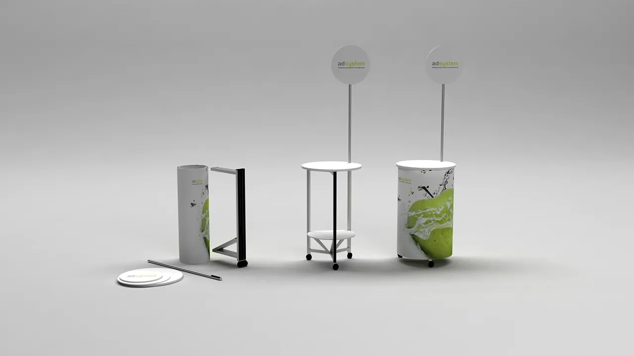 adBox Ring è un elegante tavolo da catering che si distingue per la sua struttura rotonda su ruote. Ideale per promozioni e degustazioni, offre unampia superficie espositiva.