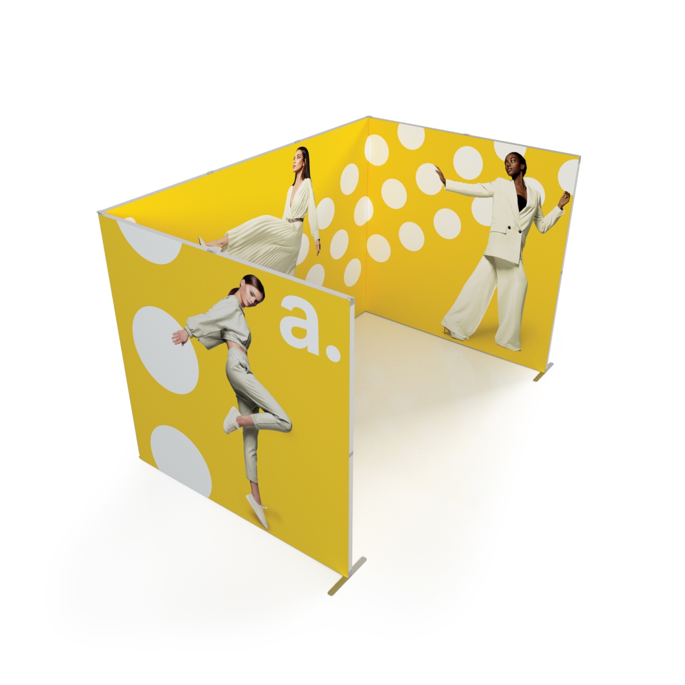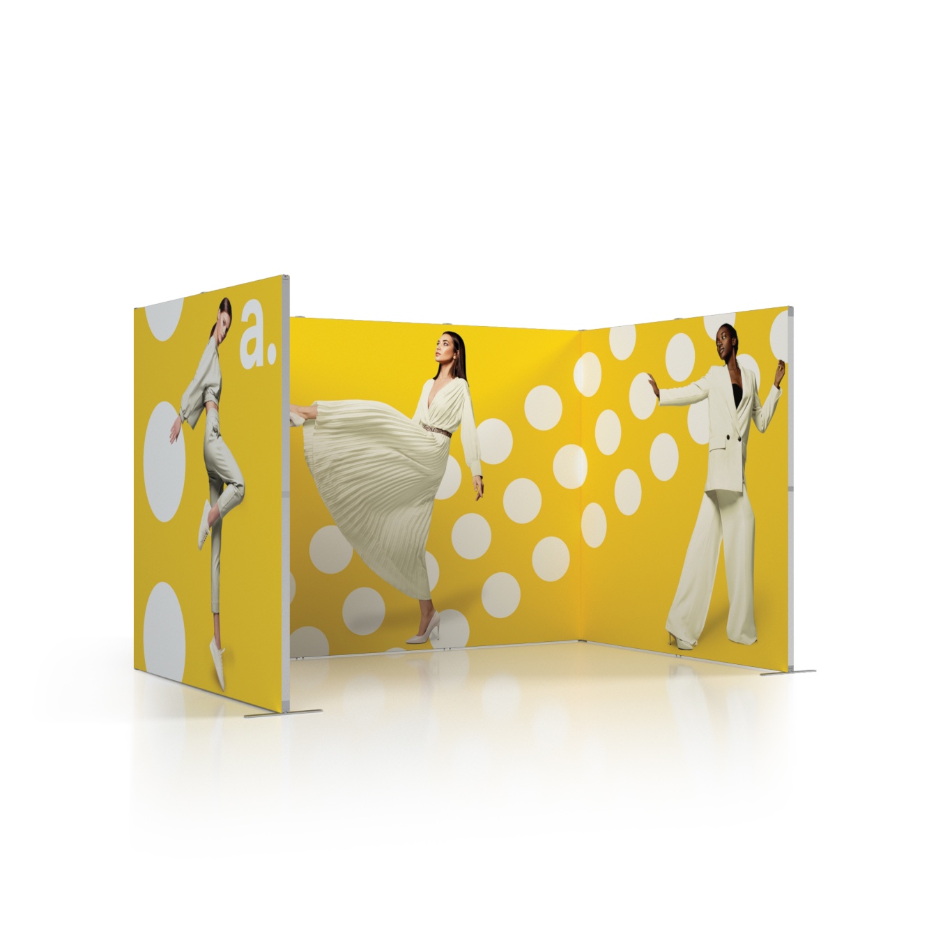 Das Foldable Messe-Set ist ein kostengünstiges Ausstellungssystem, mit dem Sie einen ordentlichen Werbestand für verschiedene Veranstaltungen vorbereiten können. Die Konstruktion der hier vorgeschlagenen Lösungen basiert auf Aluminiummodulen mit den Maßen 100x250 cm, an denen textile Drucke mit personalisierten Grafiken angebracht werden.