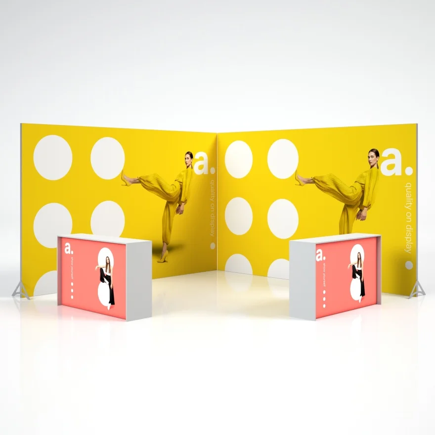 Il set Double DTF consente di allestire uno stand a forma di "L". Questa disposizione offre ampio spazio pubblicitario e comodi punti di incontro per i colloqui con i clienti. Grazie ai due banchi, puoi organizzare due punti di contatto separati, aumentando lefficienza del servizio clienti e migliorando la promozione del marchio.