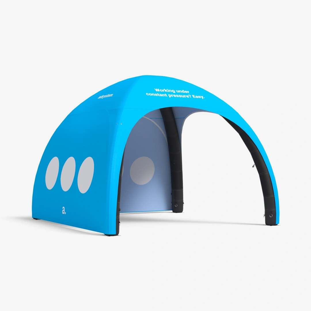 adTent Air Premium to namiot dmuchany imprezowy, który wykorzystasz nie tylko jako zabezpieczenie przed warunkami atmosferycznymi, ale również jako nośnik reklamy. Materiał pokrywający konstrukcję zadrukujemy twoimi firmowymi grafikami, dzięki czemu namiot reklamowy zwróci uwagę twoich odbiorców i przyciągnie ich do stoiska. Prezentowany tu namiot dmuchany opiera się na stałociśnieniowym stelażu, który utrzymuje niezmienny poziom powietrza dzięki specjalnym zaworom.