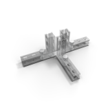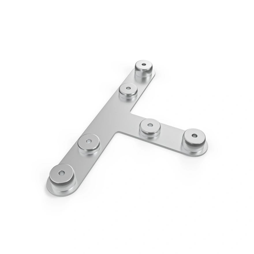 Łączniki T pozwalają połączyć trzy ramy mFrame w jednej konstrukcji, tworząc układ przypominający literę „T”. Dzięki nim stoisko nie musi ograniczać się do prostych, równoległych ścian — możesz tworzyć bardziej rozbudowane aranżacje, w których przestrzeń rozwija się w kilku kierunkach. To praktyczne rozwiązanie pozwala na wygodne wyodrębnienie różnych stref w obrębie jednej zabudowy