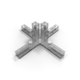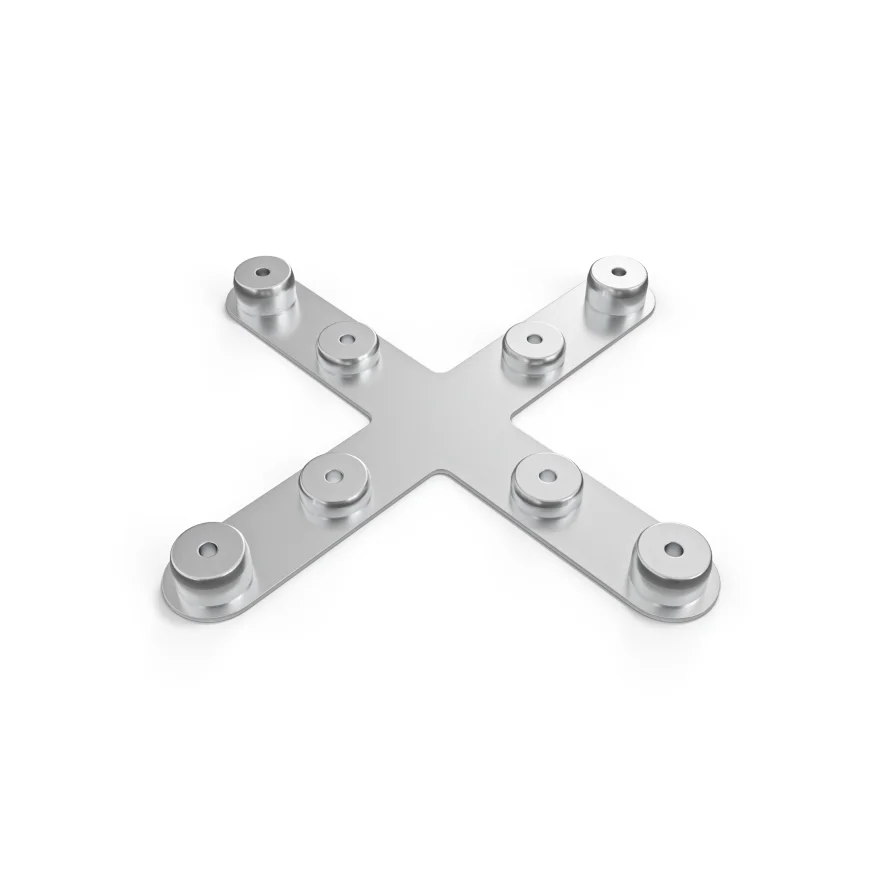 Łączniki X umożliwiają połączenie czterech ram w jednym punkcie, dzięki czemu konstrukcja może rozwijać się w czterech kierunkach jednocześnie. To rozwiązanie szczególnie przydatne przy tworzeniu większych stoisk, w których trzeba pogodzić kilka funkcji – od przestrzeni otwartej dla odwiedzających, po wydzielone strefy do spotkań i prezentacji.