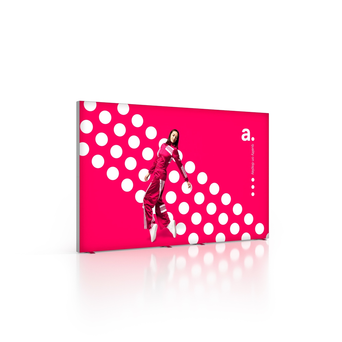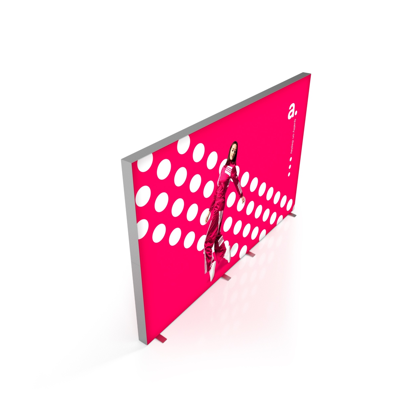 Zabudowa stoiska LMD to podświetlany, dwustronny system wystawienniczy, który wyróżni twoją markę i pomoże zaaranżować efektowne miejsce prezentacji. Stoisko na targi tego typu składa się z kasetonów ciętych na wymiar. W ich wnętrzu zamontowane są diody LED, które równomiernie oświetlają tekstylne wydruki, na których umieścimy twoje spersonalizowane grafiki. Montaż stoiska wystawowego odbywa się za pomocą kluczy imbusowych.