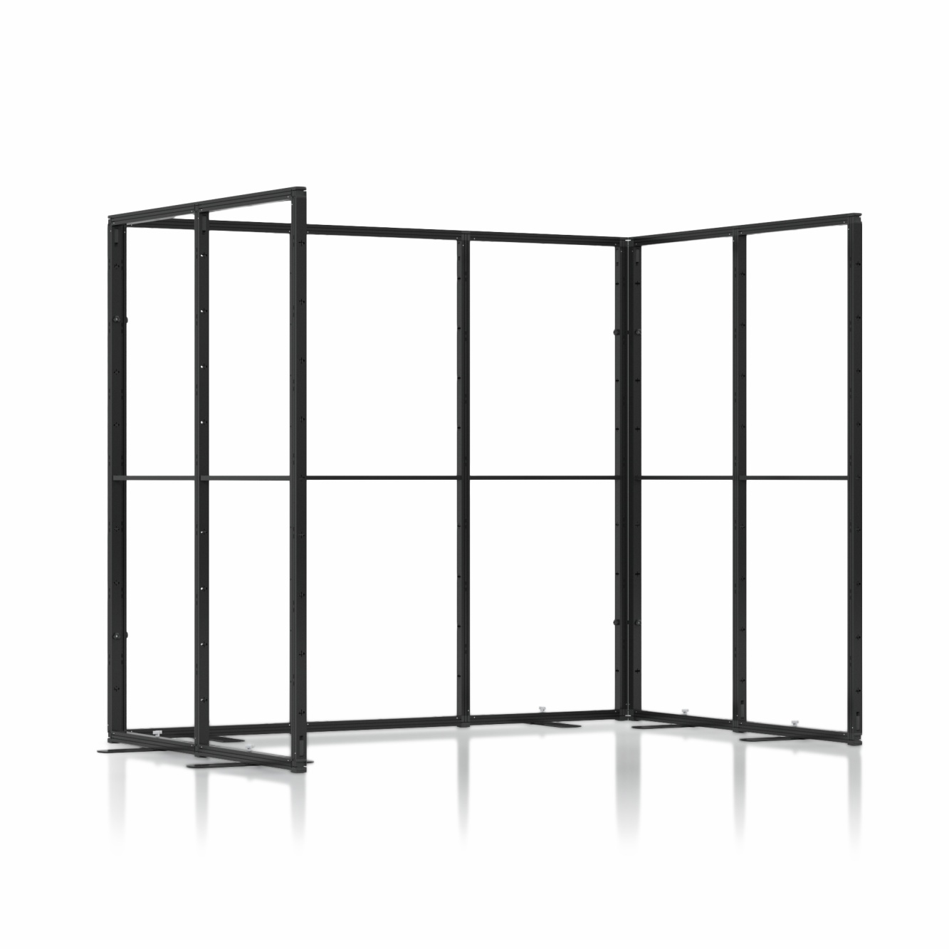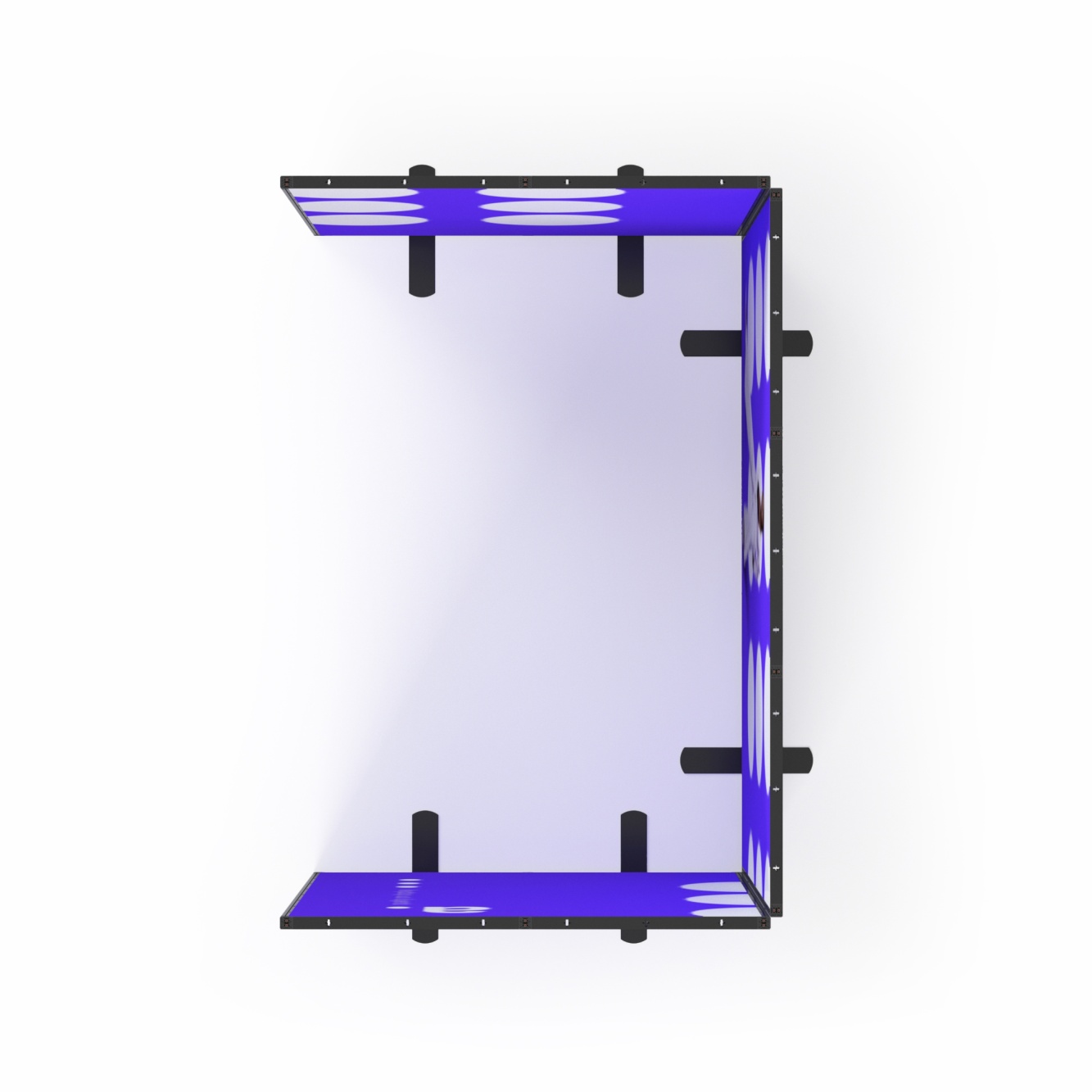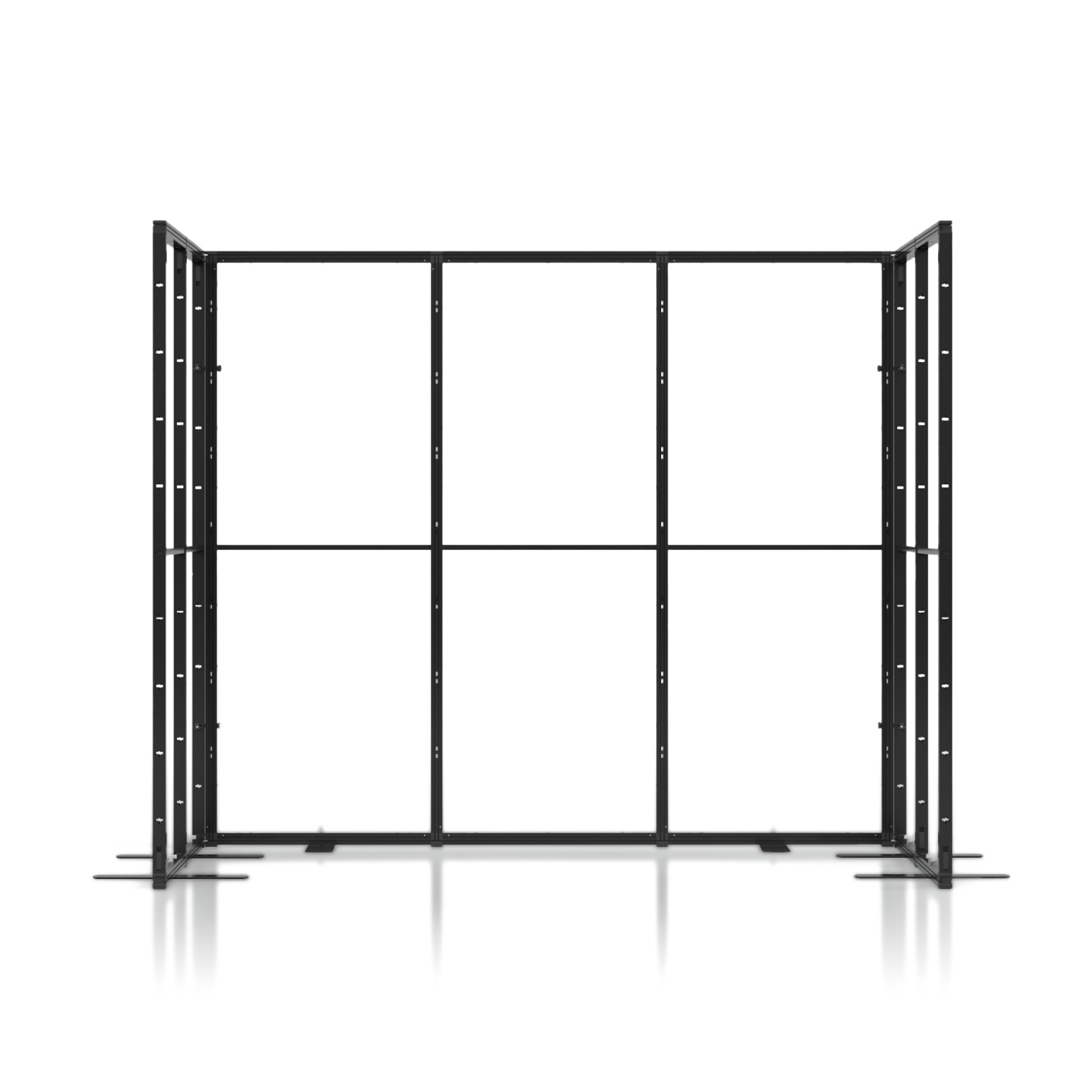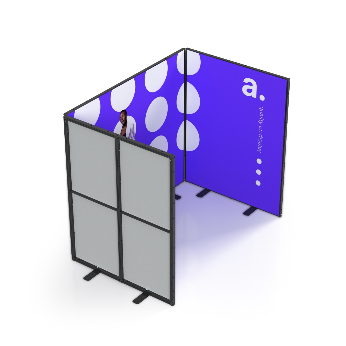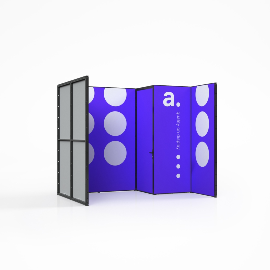 Zabudowa targowa Multiframe to sposób na stworzenie stoiska, które łatwo dopasujesz do przestrzeni i własnych pomysłów. Moduły w rozmiarach 100×250 cm i 50×250 cm pozwalają budować różne układy i prezentować grafiki na tekstylnych wydrukach, dzięki czemu Twoja marka od razu staje się bardziej widoczna. Jeśli potrzebujesz zaplecza, możesz wybrać wersję z kantorkiem i drzwiami zamykanymi na klucz. System nie ma wbudowanego podświetlenia, ale bez problemu doświetlisz go lampkami zewnętrznymi, które podkreślą kolory i detale grafik.