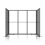 Zabudowa targowa Multiframe to sposób na stworzenie stoiska, które łatwo dopasujesz do przestrzeni i własnych pomysłów. Moduły w rozmiarach 100×250 cm i 50×250 cm pozwalają budować różne układy i prezentować grafiki na tekstylnych wydrukach, dzięki czemu Twoja marka od razu staje się bardziej widoczna. Jeśli potrzebujesz zaplecza, możesz wybrać wersję z kantorkiem i drzwiami zamykanymi na klucz. System nie ma wbudowanego podświetlenia, ale bez problemu doświetlisz go lampkami zewnętrznymi, które podkreślą kolory i detale grafik.