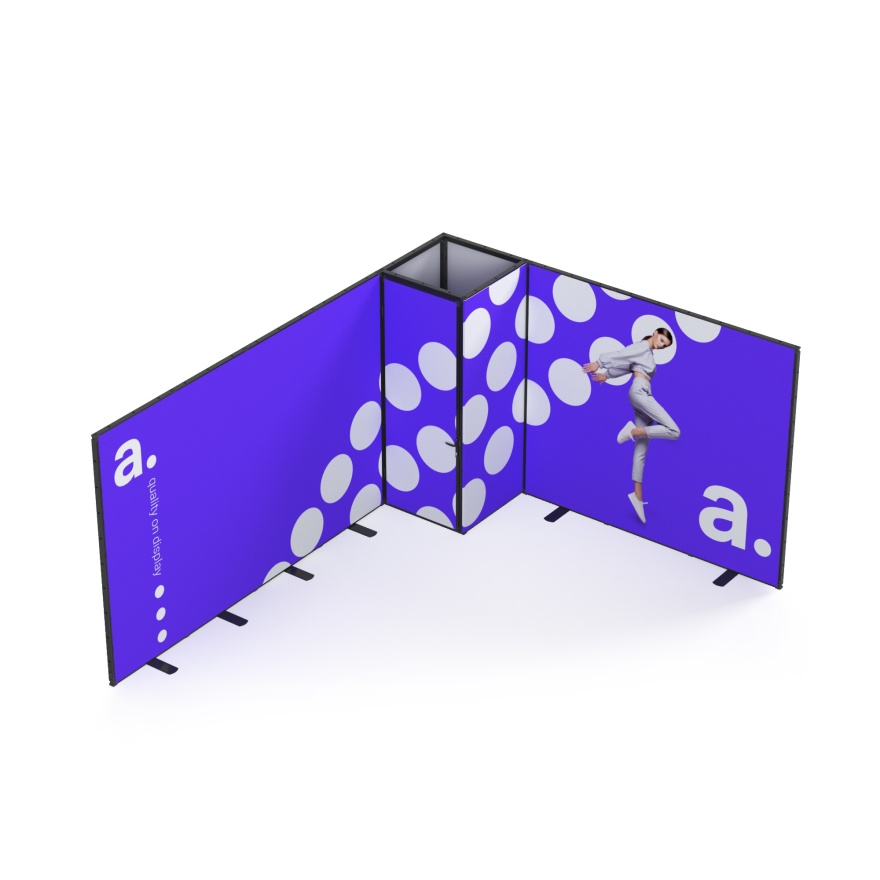 Zabudowa targowa Multiframe to sposób na stworzenie stoiska, które łatwo dopasujesz do przestrzeni i własnych pomysłów. Moduły w rozmiarach 100×250 cm i 50×250 cm pozwalają budować różne układy i prezentować grafiki na tekstylnych wydrukach, dzięki czemu Twoja marka od razu staje się bardziej widoczna. Jeśli potrzebujesz zaplecza, możesz wybrać wersję z kantorkiem i drzwiami zamykanymi na klucz. System nie ma wbudowanego podświetlenia, ale bez problemu doświetlisz go lampkami zewnętrznymi, które podkreślą kolory i detale grafik.