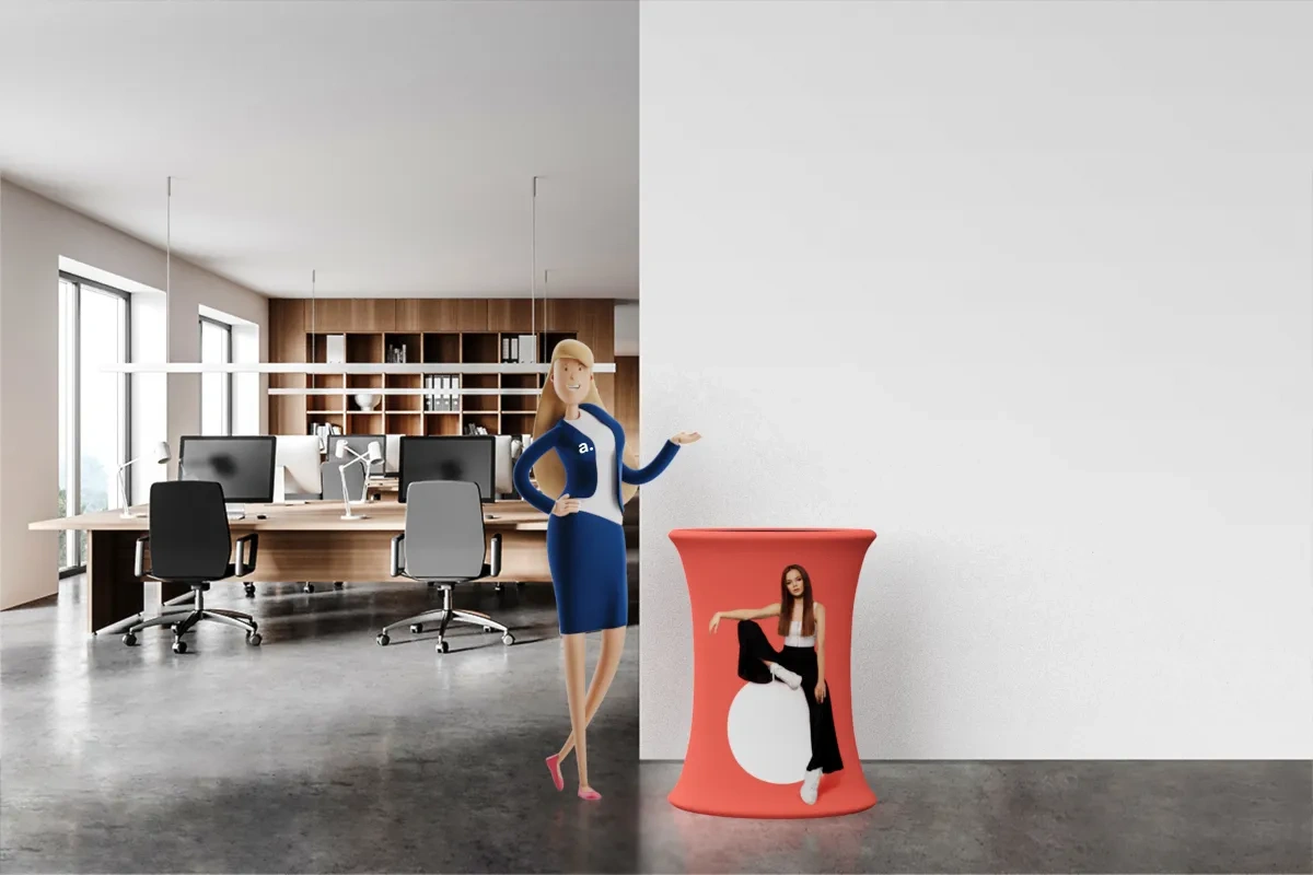 Trybunka Quick może zmieniać charakter w zależności od okazji. Raz będzie miejscem rejestracji gości, innym razem eleganckim pulpitem dla prelegentów albo punktem rozmów z klientami. Wszystko zależy od grafiki, którą na nią założysz. Wydruk można wymienić w kilka chwil, a stosowana przez nas technologia sublimacji gwarantuje, że kolory i detale na grafice zawsze wyglądają perfekcyjnie – nawet w silnym świetle hali targowej.