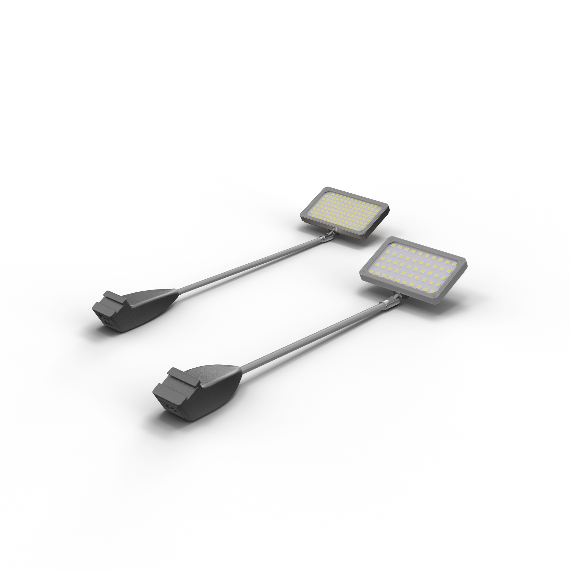 Lampy dostępne są w dwóch wariantach kolorystycznych – srebrnym i czarnym – co pozwala zachować spójny wygląd ekspozycji i dopasować oświetlenie do charakteru stoiska.