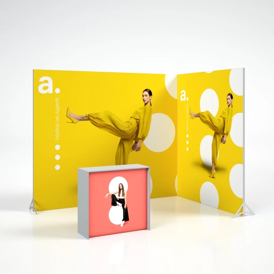 Zestaw targowy Standard DTF pozwala na szybką aranżację profesjonalnego stoiska na targach i eventach. Składa się z dwóch ścianek tekstylnych adFrame DTF o różnych wymiarach oraz podświetlanej trybunki adTribune Expo. Stoisko w kształcie litery „L” pozwala maksymalnie wykorzystać dostępną przestrzeń, a półotwarty układ zachęca klientów do swobodnej interakcji z twoją marką.