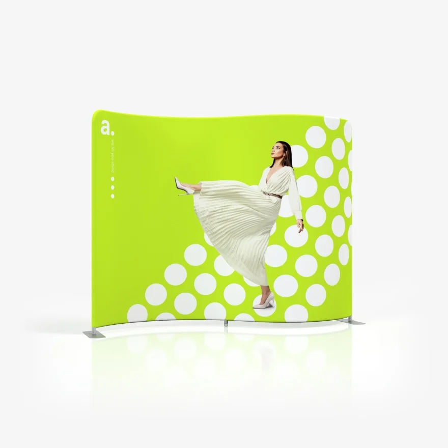 adWall Vario Serpentyna to ścianka o pofalowanym kształcie. Jej forma pozwala w ciekawy sposób zaaranżować przestrzeń targową, konferencyjną lub promocyjną.